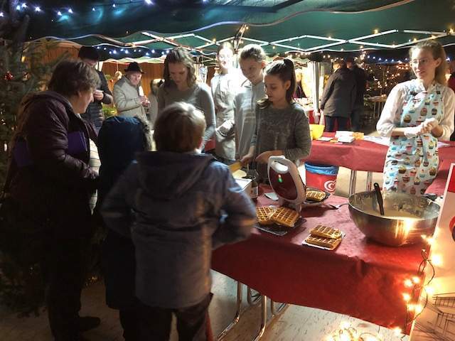 Auch der Förderverein der Gesamtschule war dieses Jahr wieder mit einem Stand vertreten, an dem Crêpes und Kartoffelwaffeln von Lehrern und Schülern angeboten wurden. Der Chor unserer Gesamtschule, unter der Leitung von Jochen Hoffmann, verbreitete mit seinen über 30 Kindern nicht nur gute Laune, sondern auch bei dem einen oder anderen Gast die Lust die weihnachtlichen Lieder mitzusingen.