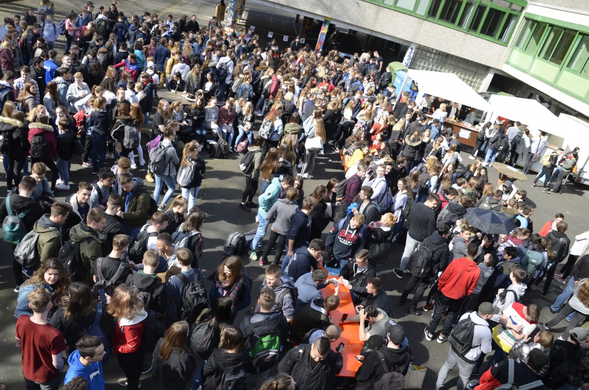 Hier liefen gleich mehrere Aktionen der älteren Schüler. Beeindruckend, wie auf Zuruf der SV mehrere hundert Schüler auf dem Schulhof zusammenrückten gegen Rassismus. Und es gab auch nachdenkliche Töne. In der Aula erinnerten Schüler der Oberstufe in einer Rede an Walter Krämer, der sich u.a. weigerte, für die Nazis tätig zu werden. Sie machten deutlich, dass Rassismus immer falsch war und falsch ist.