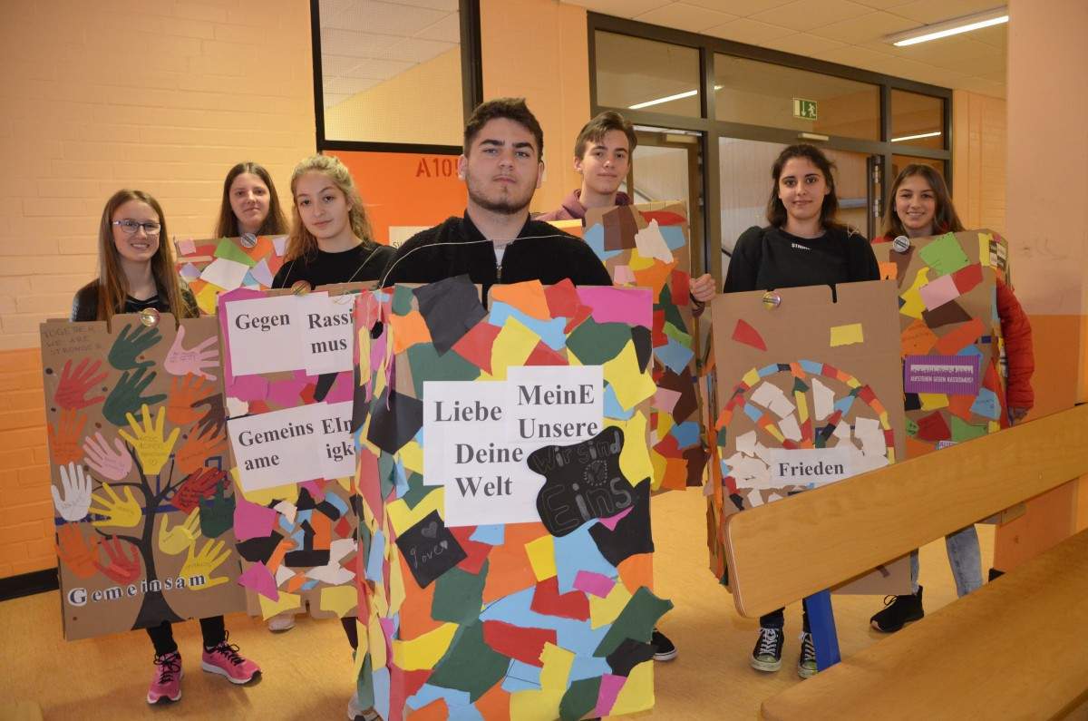 „Die einzigen Mauern, die wir bauen, sind die gegen Rassismus.“ Mit diesem Motto, knallbunten Plakaten und selbst gebauten Aufstellern machten Schüler der 9d ihren Standpunkt in Sachen Rassismus in der Talsbachstraße deutlich.