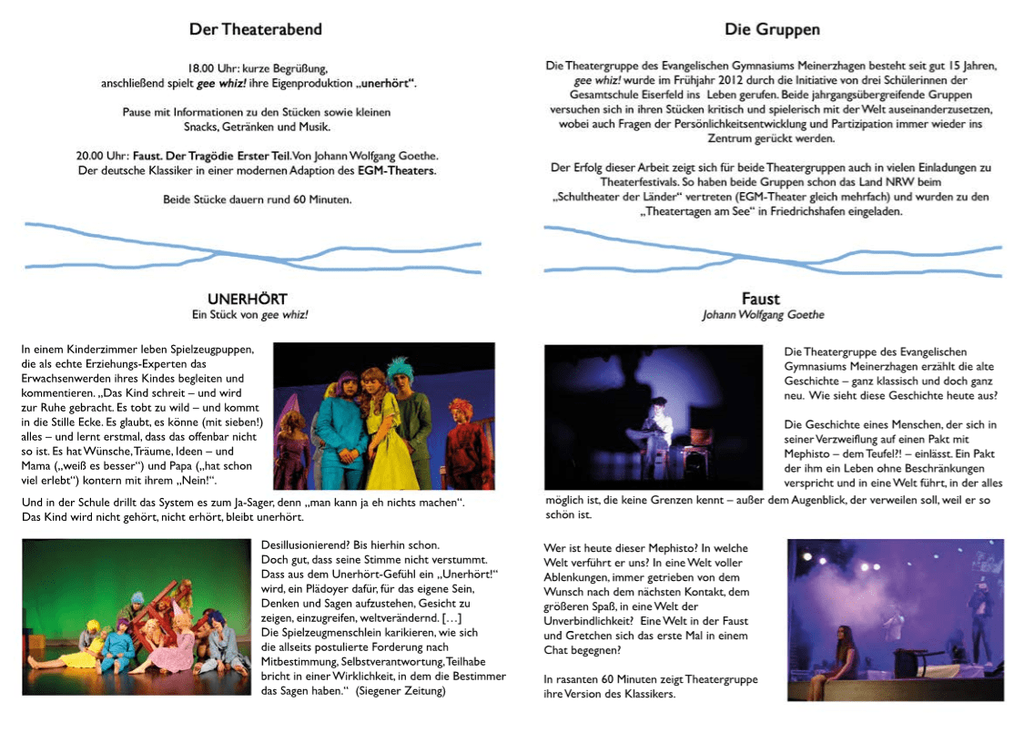 Die Theatergruppe des Evangelischen Gymnasiums Meinerzhagen besteht seit gut 15 Jahren, gee whiz! wurde im Frühjahr 2012 durch die Initiative von drei Schülerinnen der Gesamtschule Eiserfeld ins Leben gerufen. Beide jahrgangsübergreifende Gruppen versuchen sich in ihren Stücken kritisch und spielerisch mit der Welt auseinanderzusetzen, wobei auch Fragen der Persönlichkeitsentwicklung und Partizipation immer wieder ins Zentrum gerückt werden.