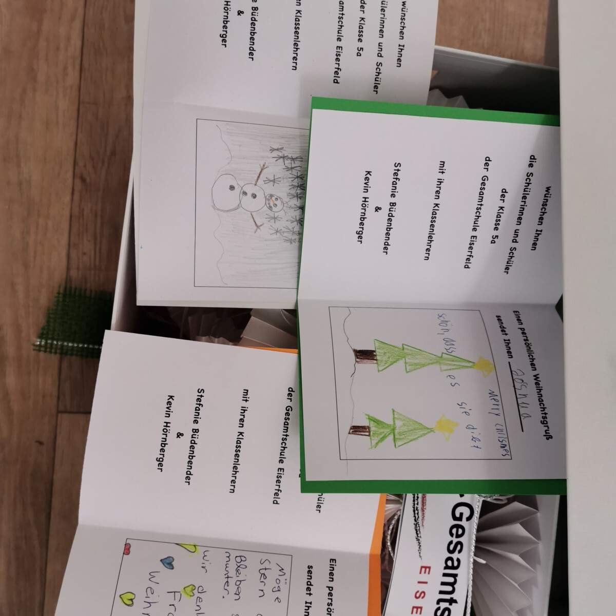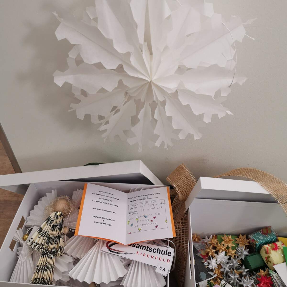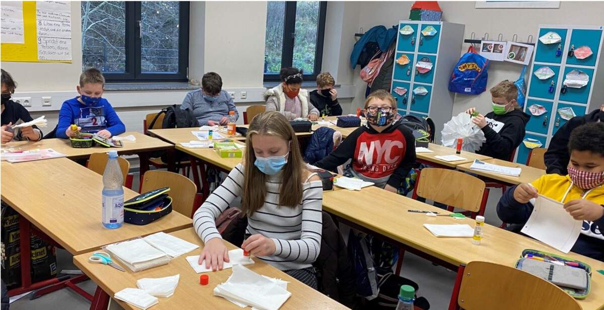 Mit diesem Ziel bastelten die Schüler*innen der Klasse 5a für die Bewohner*innen des Demenzzentrums St. Anna in Netphen unzählige individuelle Weihnachtskarten mit persönlichen Grüßen, Papierengeln und Weihnachtssterne, um den demenzkranken Bewohner*innen eine Freude zu bereiten und die Mitarbeiter*innen zu unterstützen.Da leider nicht alle Kinder die Geschenke überbringen konnten, fassten sie den Entschluss, als Klasse gemeinsam eine Weihnachtsbotschaft zu schreiben und diese in Form eines Videos zu überbringen, sodass die Bewohner*innen sehen können, wer an sie denkt und von wem die gebastelten Geschenke kommen.