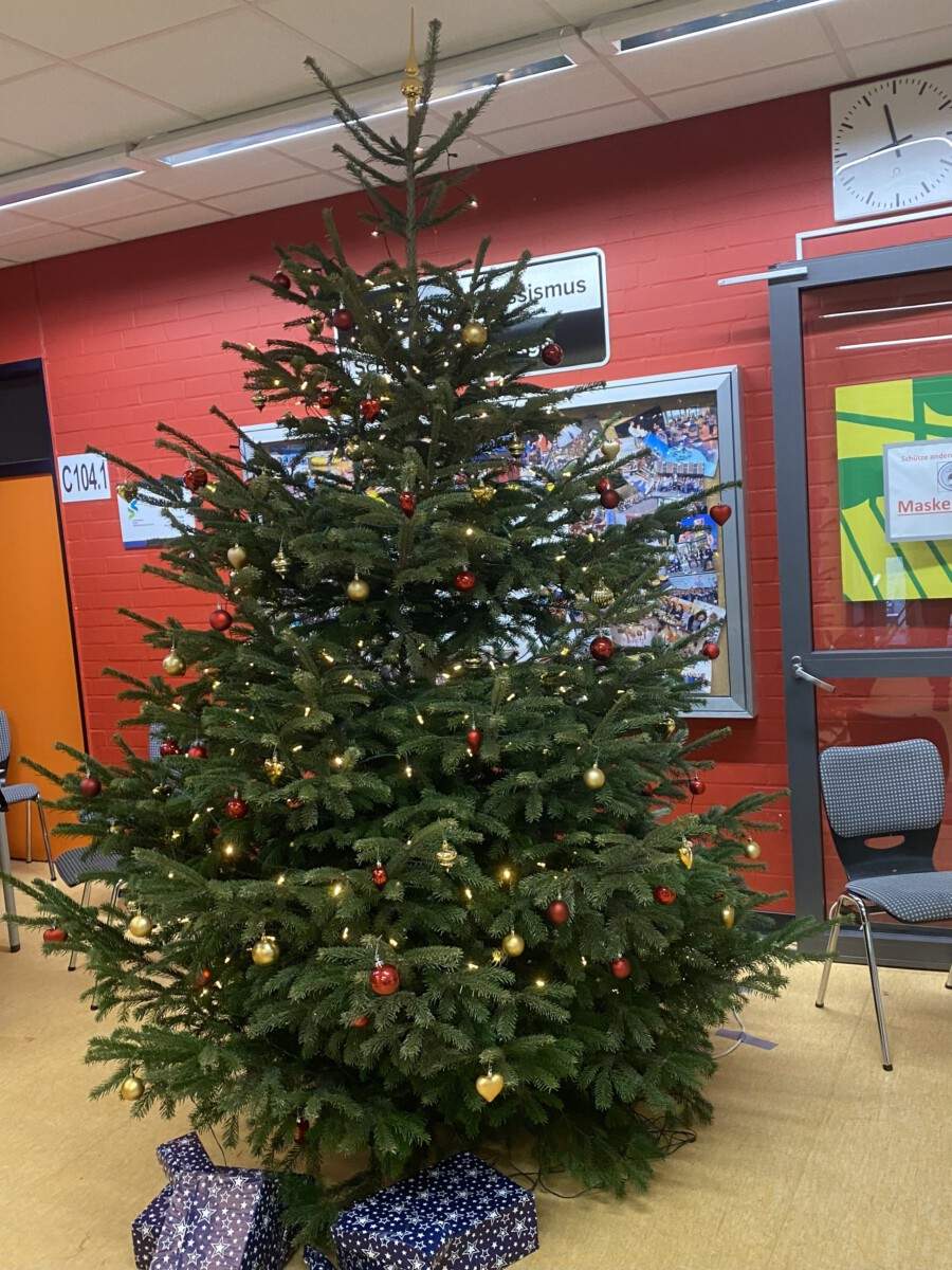 [2021-11-25 DORW] Wie jedes Jahr wird allen in der Schule bewusst, dass es jetzt langsam weihnachtlich wird, wenn es durch die Flure schallt: „Da muss noch eine Kugel hin“; „Der Baum steht aber noch schief“; “ Komm mal da runter, das kann ich mir nicht ansehen“ etc. Am Standort Talsbachstraße übernahm das dieses Jahr der Sport Leistungskurs von Herrn Hütter. Hier galt es die Spitze zu erklimmen und alles daran zu setzen nicht herunterzufallen. Am Teilstandort Hengsberg hat dieses Jahr Frau Breuer mit ihrer Klasse 7D die Weihnachtszeit eingeläutet.