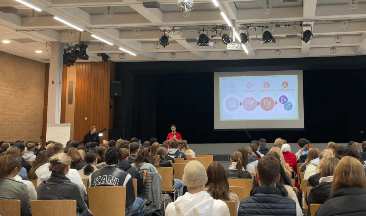 Etwa 200 SchülerInnen der Oberstufe fanden sich in der 3. Stunde zu einer Infoveranstaltung der DKMS zusammen. Dabei informierte der Referent, Philipp Albrecht, ausführlich über die Regularien, den Ablauf und die Bedeutung von Stammzellspenden. Mit an seiner Seite war der 21-jährige Stammzellspender Scott, der selbst erst vor kurzem eine Stammzellspende leisten und damit womöglich ein Menschenleben retten konnte. Er berichtete über seine Erfahrungen und Eindrücke während seiner eigenen Registrierung bis hin zur Stammzellspende. Dabei nahm er sicher einigen die Bedenken oder die Angst vor dem Schritt der Aufnahme in die Stammzellspenden-Kartei.