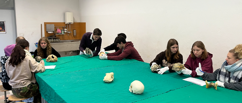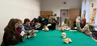 Der Biologie-Leistungskurs startete mit einem archäologischen Workshop zu Humanfossilien in der Steinzeitwerkstadt des Neanderthal-Museums. Die Ausprägung von Überaugenwulst, Vorhandensein von Scheitelkamm und Hinterkopfwulst, die Lage des Hinterhauptlochs und das Hirnvolumen – das waren nur einige Merkmale, anhand derer die Schülerinnen und Schüler das Alter und die evolutive Reihenfolge verschiedener Schädelknochen bestimmen konnten. Durch den Input und die Hilfestellung einer Archäologin gelang die Einordnung der Fossilien nach intensiver Begutachtung mit weißen Samthandschuhen gut.