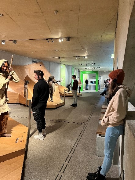 Im Museum wurden alle Biolog:innen mit Kopfhörern ausgestattet und konnten die Sammlung zur Humanevolution per Audio-Guide selbst erkunden. Der interaktive Rundgang durch das Museumsgebäude bot neben vielzähligen Audio-Informationen auch immer wieder Forscher-Boxen, an denen Info-Schubladen mit Exponaten aufgezogen werden konnten. Neben der gesamten Humanevolution beinhalteten die Stationen insbesondere die Geschichte des Neandertalers, von dem italienische Steinbrucharbeiter 1856 bei Mettmann Knochenfragmente fanden. Dies verlieh dem Neanderthal seinen Namen. Homo sapiens neanderthalensis hat sich auch mit dem modernen Menschen Homo sapiens sapiens vermischt und so stecken seine Gene auch heute noch zu 1-4 Prozent in uns Europäern.