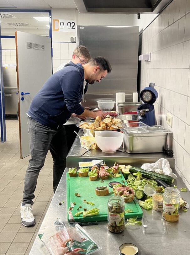 Und tatsächlich fanden sich Hannah, Romina, Cinar, Sarah, Amelie, Joline, Dilara, Jannik, Elif, Enes und Aaliyah freiwillig um 04:30 Uhr in der Mensa ein, um ein Catering auf die Beine zu stellen, das seinesgleichen sucht: Neben Flammkuchen, Pizzabrötchen und Tomate – Mozzarella Sticks wurden Himbeeren auf Curry-Dattel Canapés angerichtet, Schafskäse in Weinblätter gewickelt, Lachsrollen geschnitten und vieles mehr.