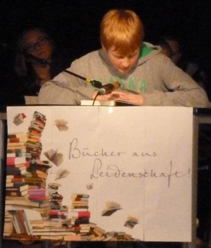 Nach dieser Vorstellungsrunde begann auch schon die erste Leserunde. Alle acht Teilnehmer lasen hintereinander einen eigens ausgewählten Text dem Publikum vor. Der Jury gehörten die zwei ehemaligen Lehrerinnen Brigitte Judt und Karin Frank, die Referendarin Patrycja Schrei und die Schüler Leonie Bohmhauer und Michel Kretzer aus der 11. Jahrgangsstufe an. Sie bewerteten im Anschluss die Lesetechnik und das Textverständnis. Während die Jury beriet, spielte Sergey Krinov ein russisches Lied auf seiner Gitarre und ließ somit keine größere Unruhe in den Reihen des Publikums aufkommen. Insgesamt vier Schülerinnen und Schüler kamen das der Auswahl der Jury in die nächste Runde. Der Schwierigkeitsgrad stieg nun deutlich an, da die Schülerinnen und Schüler einen Fremdtext aus dem Buch „Rico, Oskar und das Herzgebreche“ von Andreas Steinhöfel bekamen. In dieser Runde trennte sich nun sprichwörtlich das Spreu vom Weizen. Bevor es jedoch zum Endergebnis kam und der Sieger des Vorlesewettbewerbs feststand, sangen die Schülerinnen Jenny Werder und Nora Dakak das Lied „Price Tag“ von Jessie J.Nun stand das Ergebnis fest. Die Moderatorinnen Annika und Rosa bedankten sich zunächst bei den Teilnehmern der hinteren Plätze, bevor sie Noah Benjamin Kerssen zum Sieger kürten. Sichtlich erfreut nahm Noah seine zwei Bücherpreise entgegen.