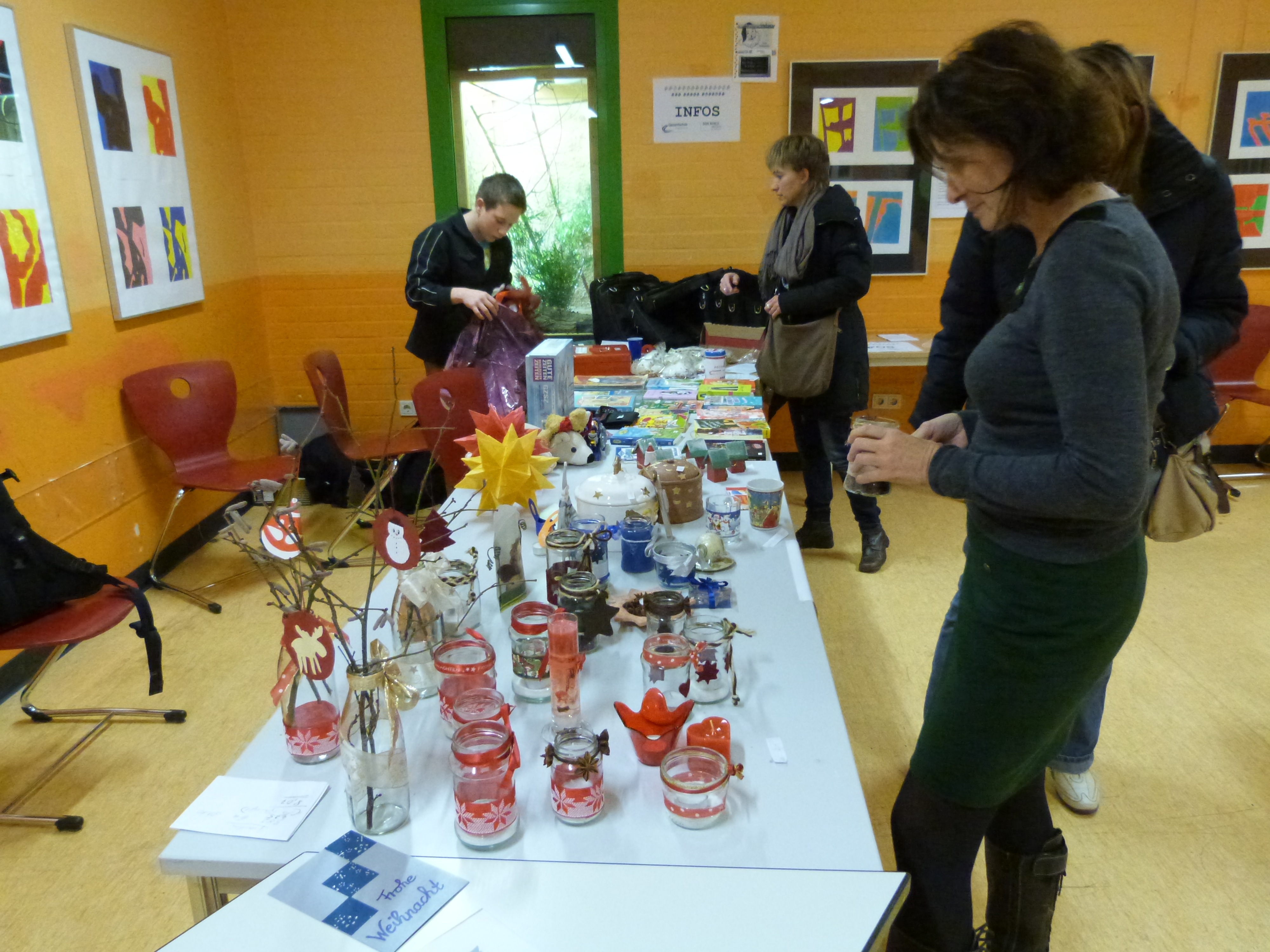 [26.11.12 R.Jung] Am Elternsprechtag letzten Mittwoch haben Schüler der Klasse 8d selbst gebastelte weihnachtliche Dekoration und Grußkarten verkauft. Das Warenangebot wurde noch erweitert durch Bücher aus der Klassenbücherei, gespendete Laptoptaschen, Christstollen, weihnachtliche Deko-Artikel und Spiele. Viele Eltern und Kollegen legten auch etwas in die bereitgestellte Spendendose. In den vorangegangenen Wochen wurden bereits Einweg-Pfandflaschen eingesammelt, die sonst in den Müll gewandert wären. Hier haben auch Schüler der 6.Klassen fleißig mitgeholfen. So kamen schließlich 334,15 € zusammen. Schüler engagieren sich: weiterlesen