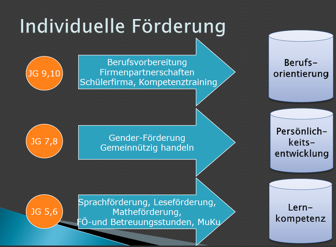 Wir wollen jedes Kind mit seinen individuellen Fähigkeiten wahrnehmen. Daher ist das Konzept der individuellen Förderung grundlegend für unsere pädagogische und unterrichtliche Arbeit. An unserer Schule greifen in den unterschiedlichen Jahrgängen verschiedene Förderkonzepte, die sich auch aus den Säulen unseres Schulprogramms ableiten.