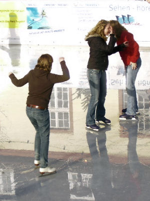Wassermassen auf der Eisfläche alle trocken und gut gelaunt.